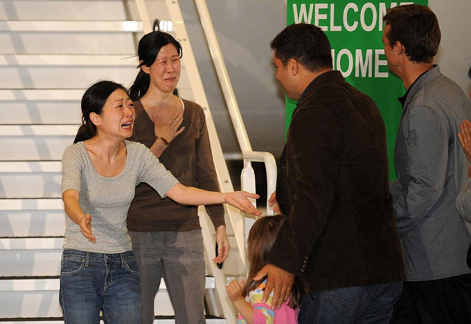 I giornalisti Euna Lee e Laura Ling, che erano stati arrestati in Corea del Nord e condannati a 12 anni di lavori forzati, si riuniscono con le loro famiglie in California dopo la positiva mediazione diplomatica degli Stati Uniti