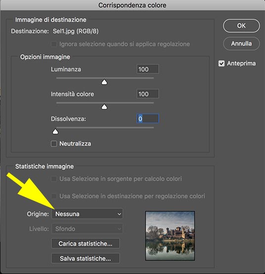 Ora con le due immagini aperte in file separati ci posizioniamo sull'originale e utilizzamo il comando "Corrispondenza colore" dal menù a tendina Immagine > Regolazioni > Corrispondenza colore: