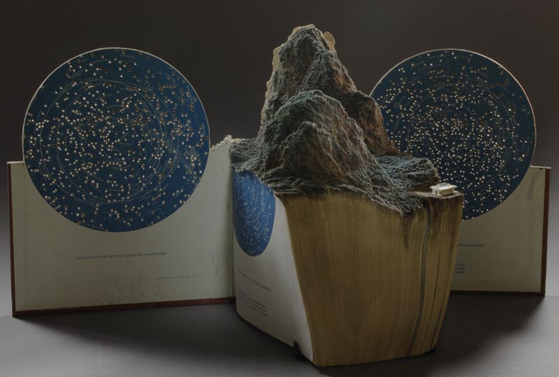 L'artista trasforma libri d'epoca, che hanno testimoniato e trasmesso la conoscenza per generazioni, montagne di conoscenza che potrebbero risultare obsolete o in disuso, riportandoli ad essere ciò che essenzialmente sono: montagne. Rocce e ambientazioni su cui si radica il sapere e la civiltà.