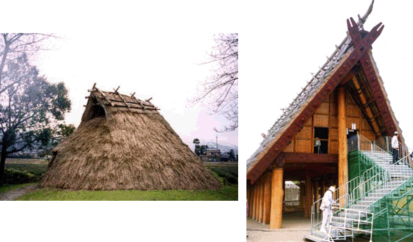 | A sinistra: ricostruzione di una casa Jomon. Destra: struttura elevata su pali confitti nel suolo del periodo Yayoi. |